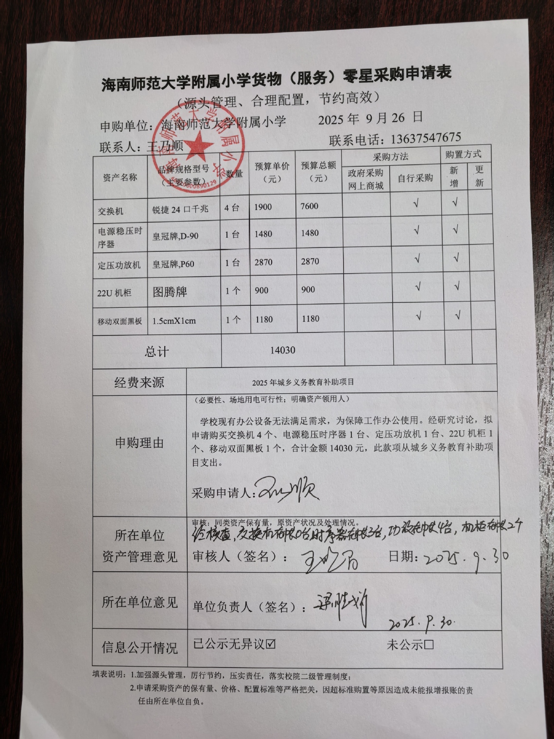 学校现有办公设备无法满足需求,为保障工作办公使用。经研究讨论,拟申请购买交换机4个、电源稳压时序器1台、定压功放机1台、22U机柜1个、移动双面黑板1个,合计金额14030元。