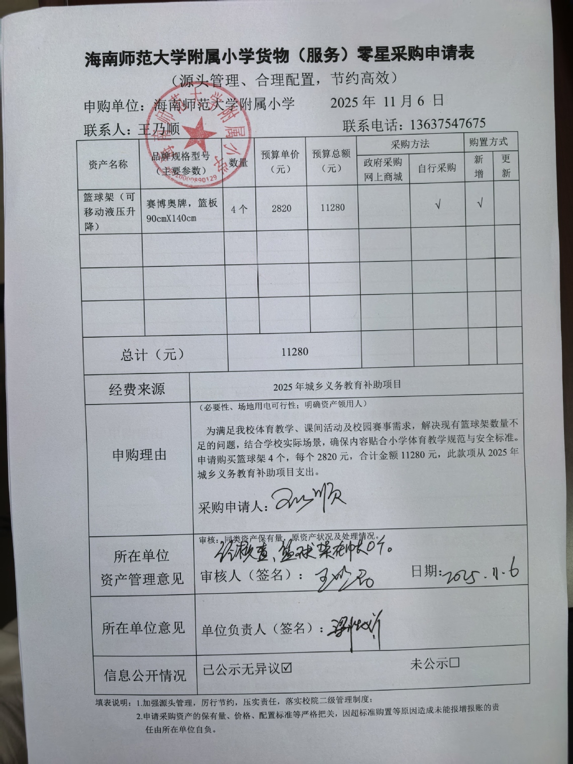 为满足亚洲赌场排名体育教学、课间活动及校园赛事需求,解决现有篮球架数量不足的问题,结合学校实际场景,确保内容贴合小学体育教学规范与安全标准。申请购买篮球架4个,每个2820元,合计金额11280元。