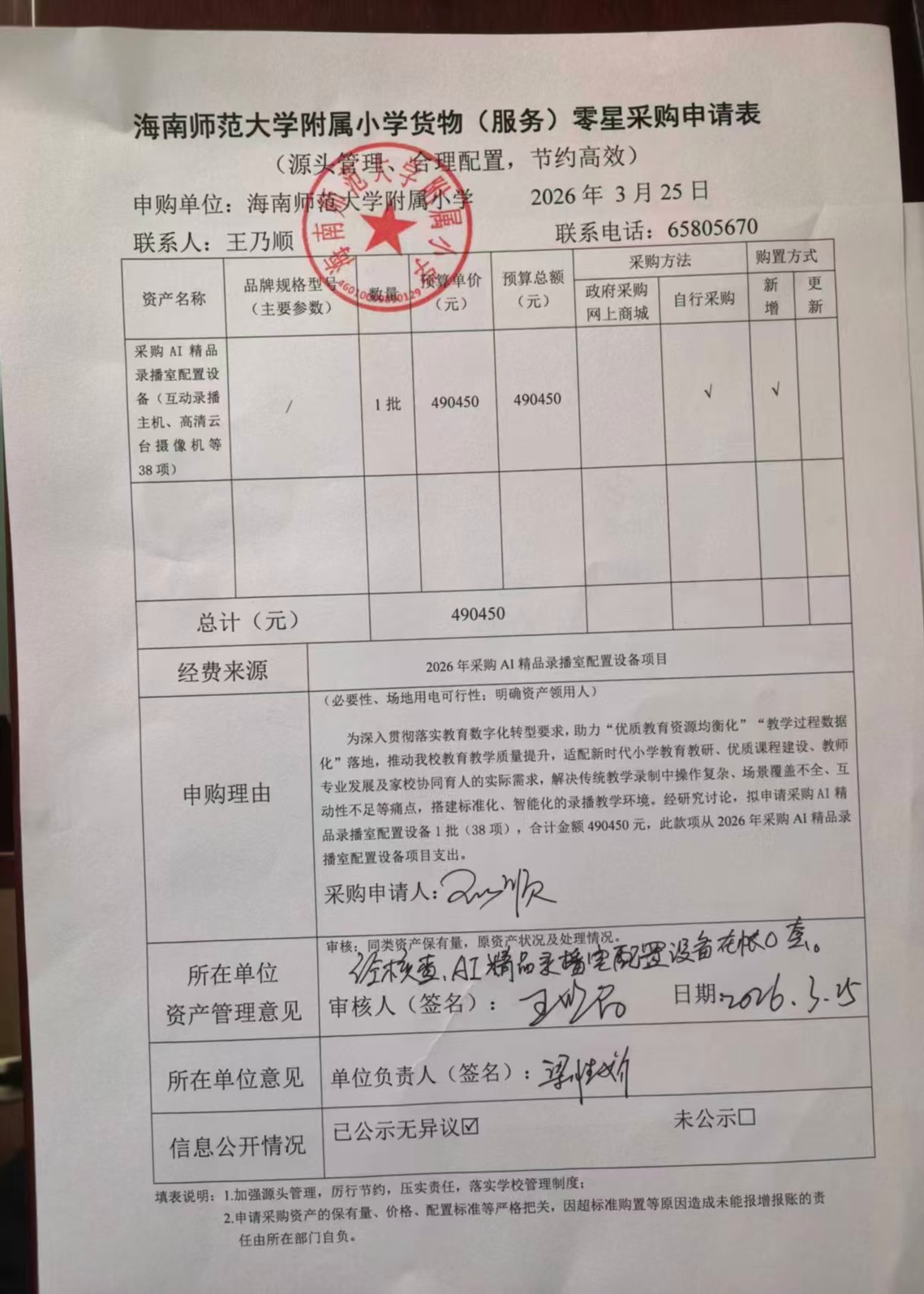 为深入贯彻落实教育数字化转型要求,助力"优质教育资源均衡化""教学过程数据化"落地,推动亚洲赌场排名教育教学质量提升,适配新时代小学教育教研,优质课程建设,教师专业发展及家校协同育人的实际需求,解决传统教学录制中操作复杂,场景覆盖不全,互动性不足等痛点,搭建标准化,智能化的录播教学环境。经研究讨论,拟申请采购AI精品录播室配置设备1批(38项),合计金额490450元。